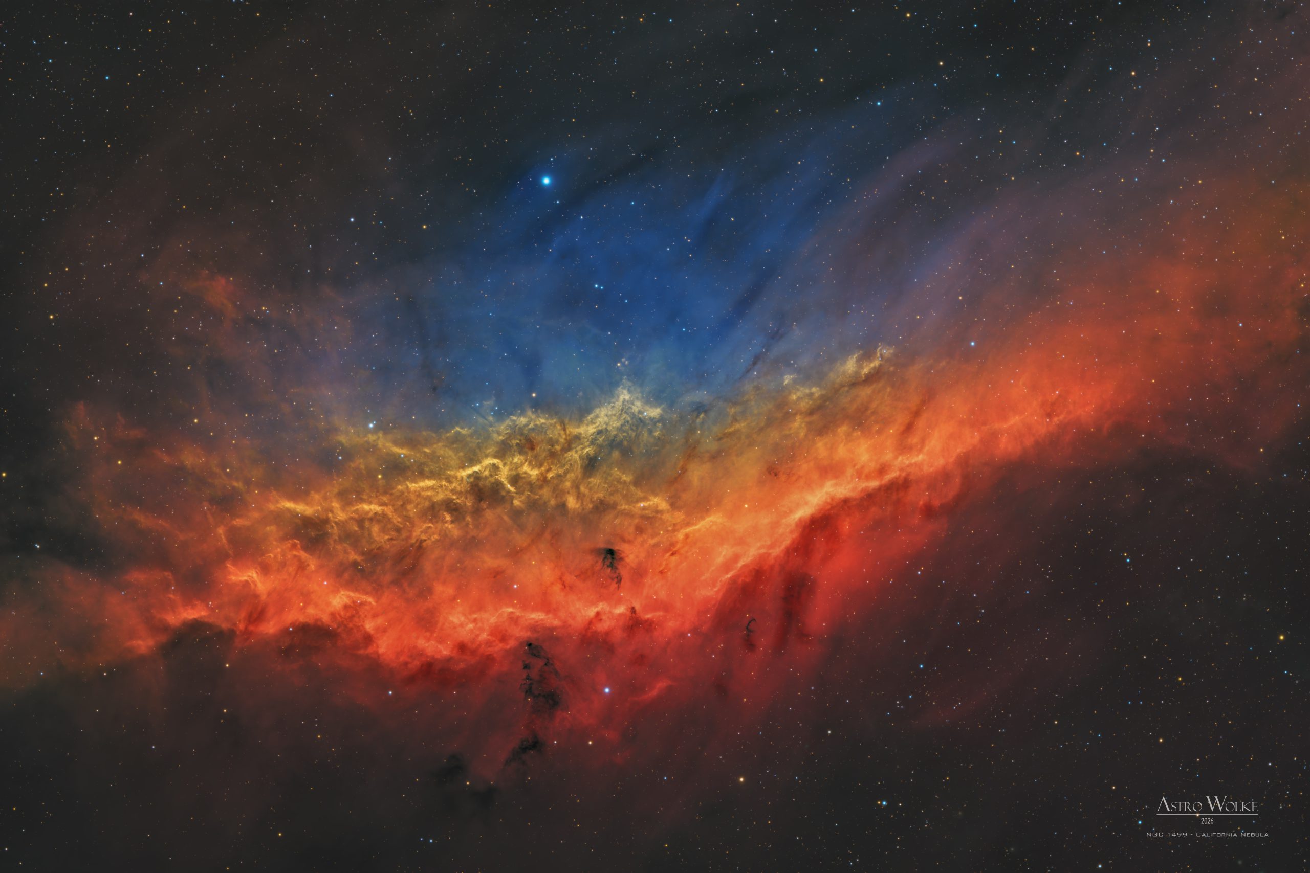 In the constellation Perseus lies the emission nebula NGC 1499 (“the California Nebula”). Dark dust filaments absorb light and appear as silhouettes against the glowing gas—tracing dense material from which new stars can form over time in regions like this. NGC 1499 is roughly about 1,000 light-years away and is exceptionally large on the sky, spanning around 2.5° in length (about five full Moon diameters).