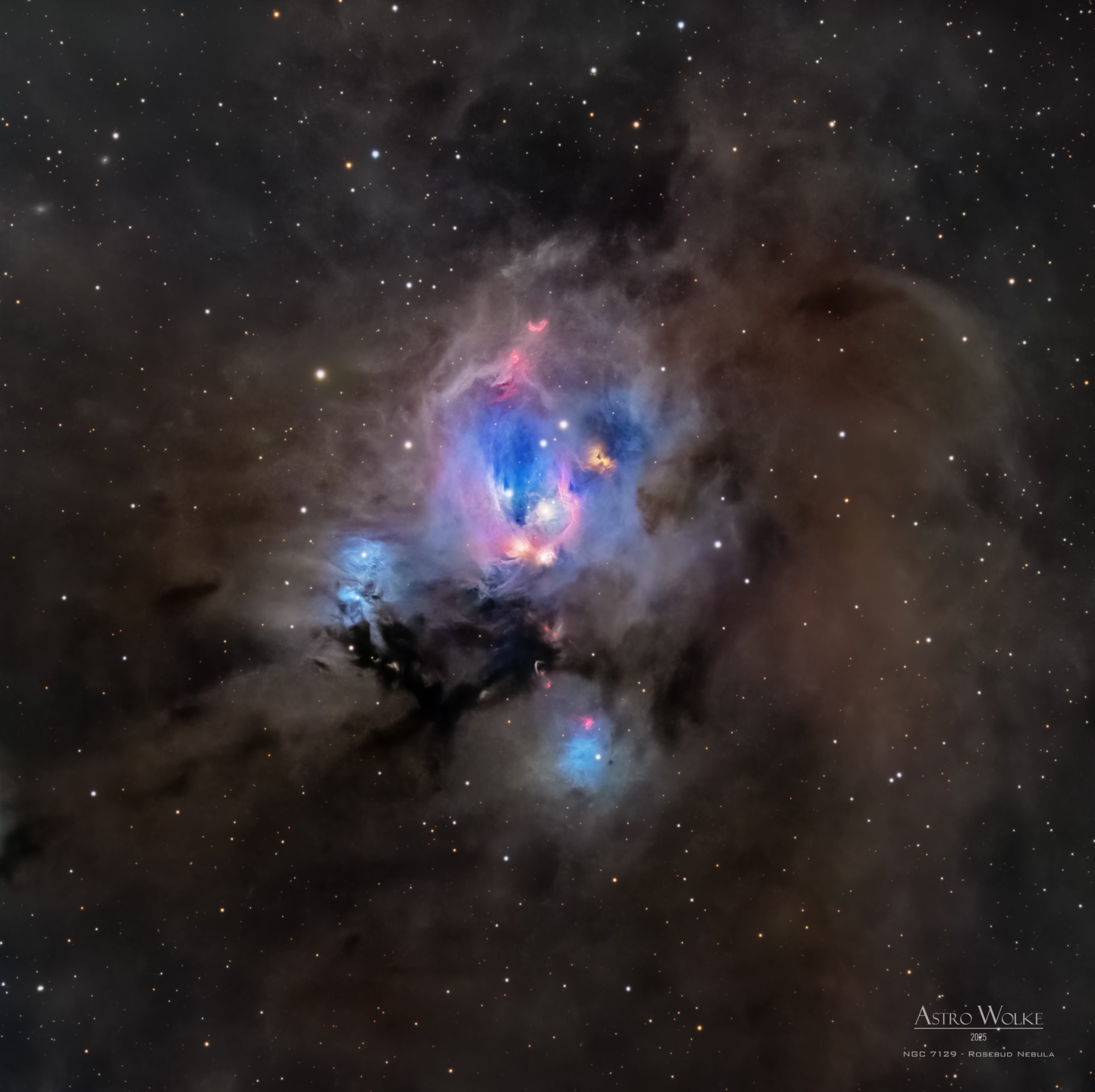 NGC 7129 ist damit ein Paradebeispiel für die frühe Phase der Sternentstehung: chaotisch, leuchtend, von Kräften und Gegensätzen geprägt. Für Astrofotografen zählt er zu den reizvollsten Motiven des Herbsthimmels. Mit langen Belichtungszeiten offenbart sich ein faszinierendes Zusammenspiel aus blauen Reflexionsnebeln, rötlichen Emissionszonen und dunklen Staubbändern – ein kosmisches Gemälde, das von der Geburt junger Sonnen erzählt.