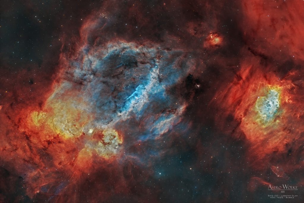 In the constellation Cassiopeia, two magnificent emission nebulae dominate the scene: Sh2-157, the Lobster Claw Nebula, and the smaller, spherical NGC 7635, known as the Bubble Nebula – or affectionately as the “Hubble Bubble.”